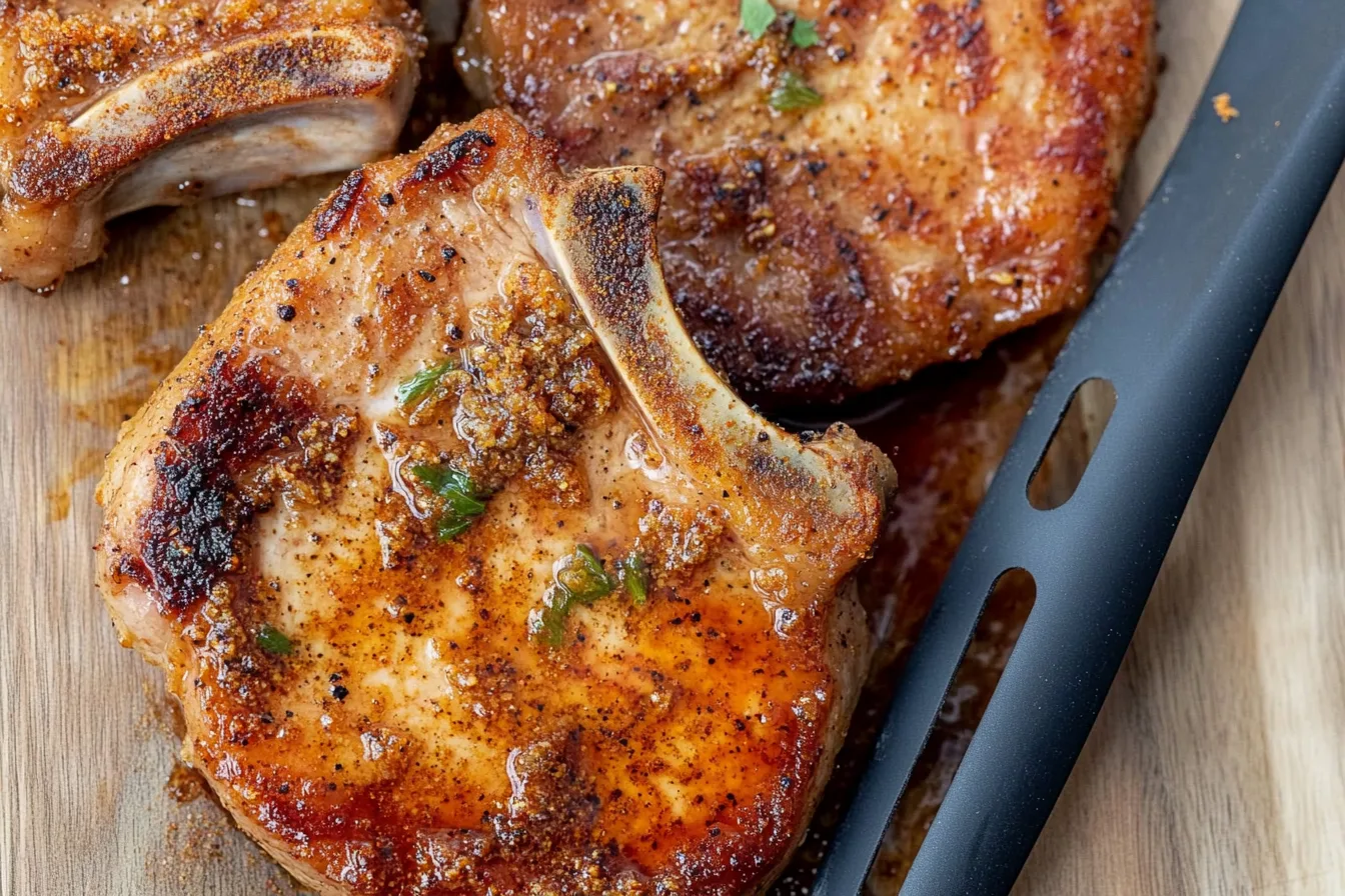 Once cooked, remove the pork chops from the air fryer and let them rest on a plate for about 5 minutes. This helps the juices redistribute throughout the meat.