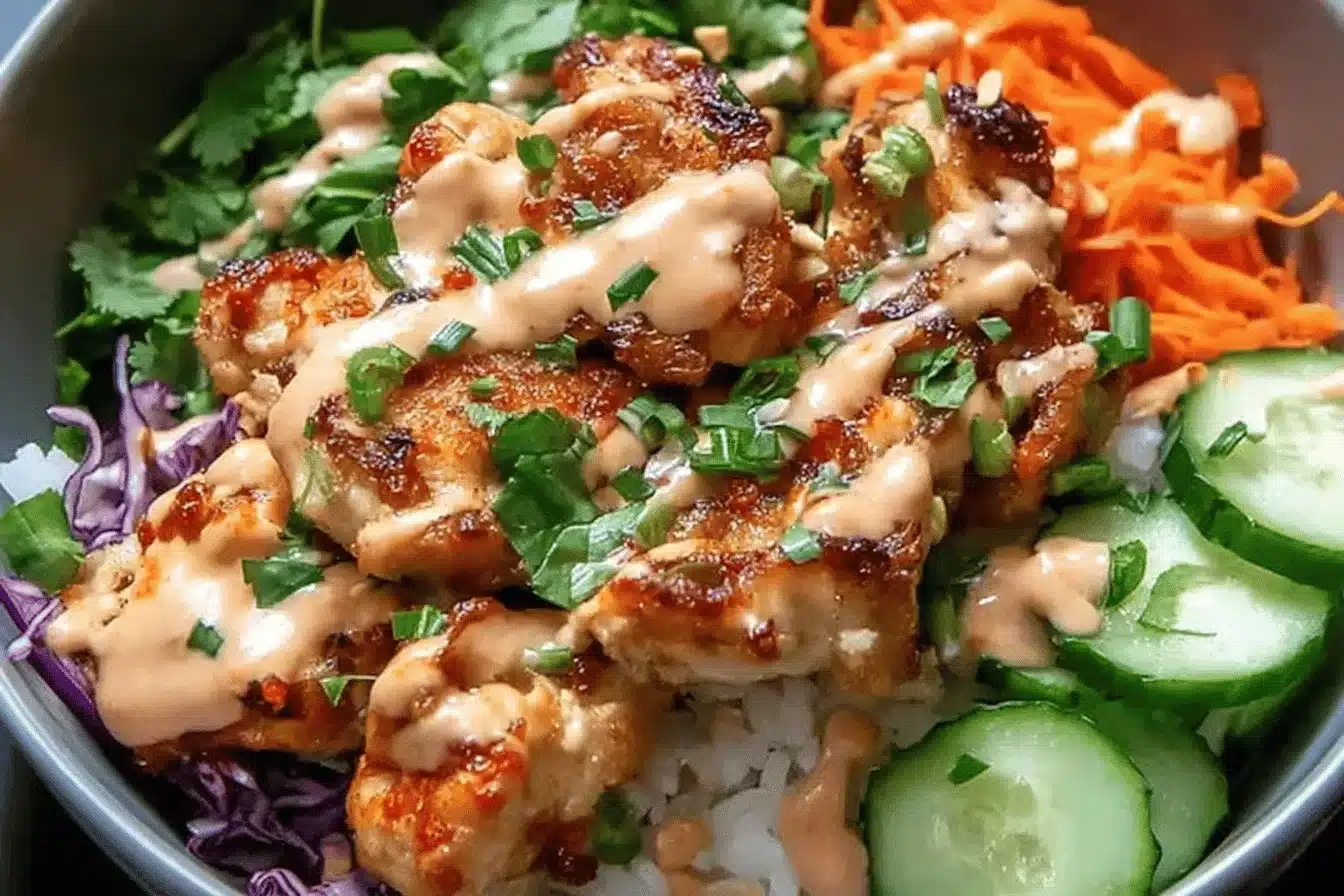 A Bang Bang Chicken Bowl is a high-protein dinner idea featuring tender cooked chicken coated in a creamy, spicy sauce served over rice with fresh veggies.