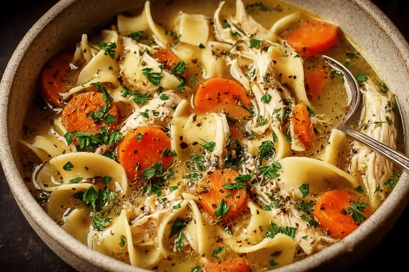 Once the noodles are fully cooked and the soup is well-seasoned, ladle the soup into bowls. Serve immediately, garnished with fresh parsley if desired.