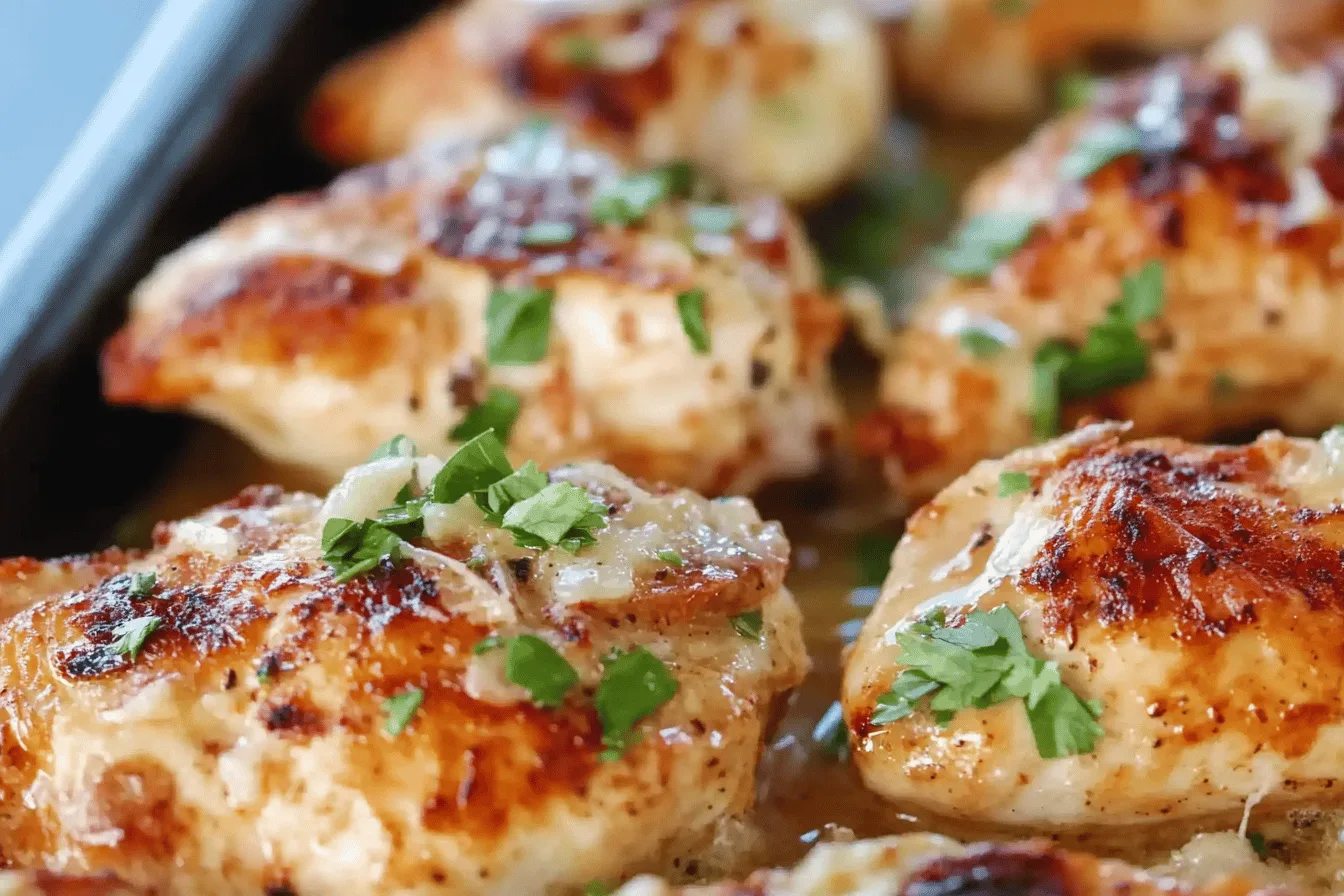 Serve the garlic Parmesan chicken warm, garnished with extra parsley and Parmesan cheese if desired.