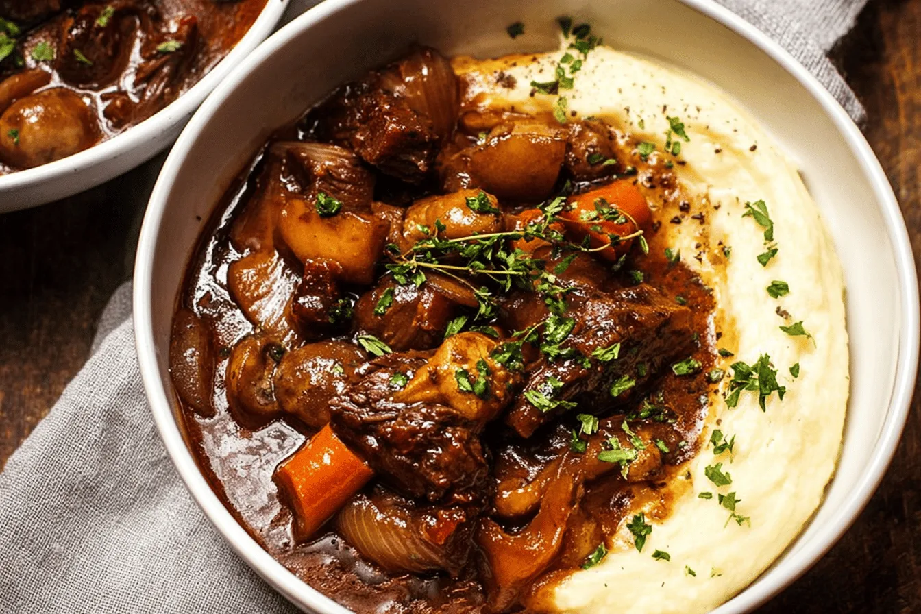 Rich, fall-off-the-bone short ribs cooked low and slow with a velvety red wine sauce.