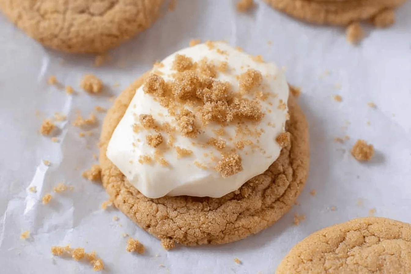 Once baked, allow the cookies to cool completely. While they cool, prepare the cheesecake frosting by creaming the softened butter, cream cheese, powdered sugar, and vanilla together until smooth and fluffy. Pipe the frosting on each cooled cookie and sprinkle with graham cracker crumbs for the perfect finishing touch.