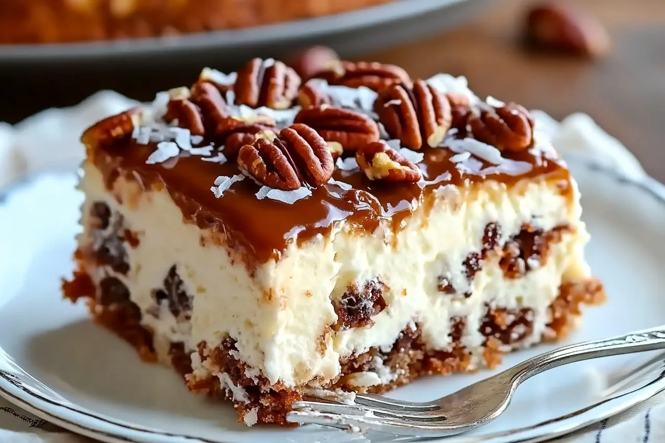 Pour an even layer of crushed pineapple (with juice), followed by a layer of shredded coconut, and then sprinkle a layer of chopped nuts on top of the batter.