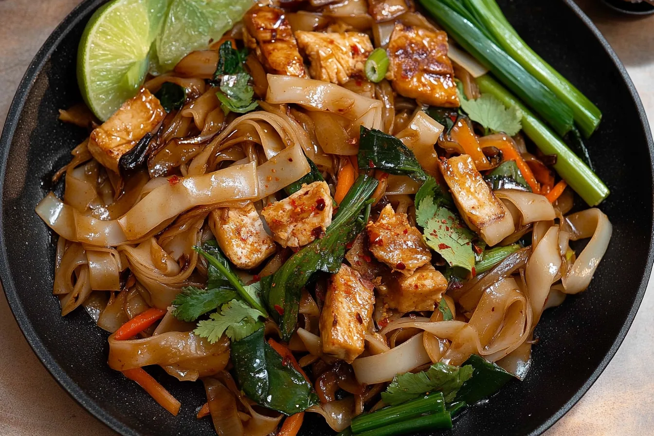 A classic Thai dish made with stir-fried rice noodles, shrimp or chicken, bean sprouts, and peanuts, flavored with tamarind paste.
