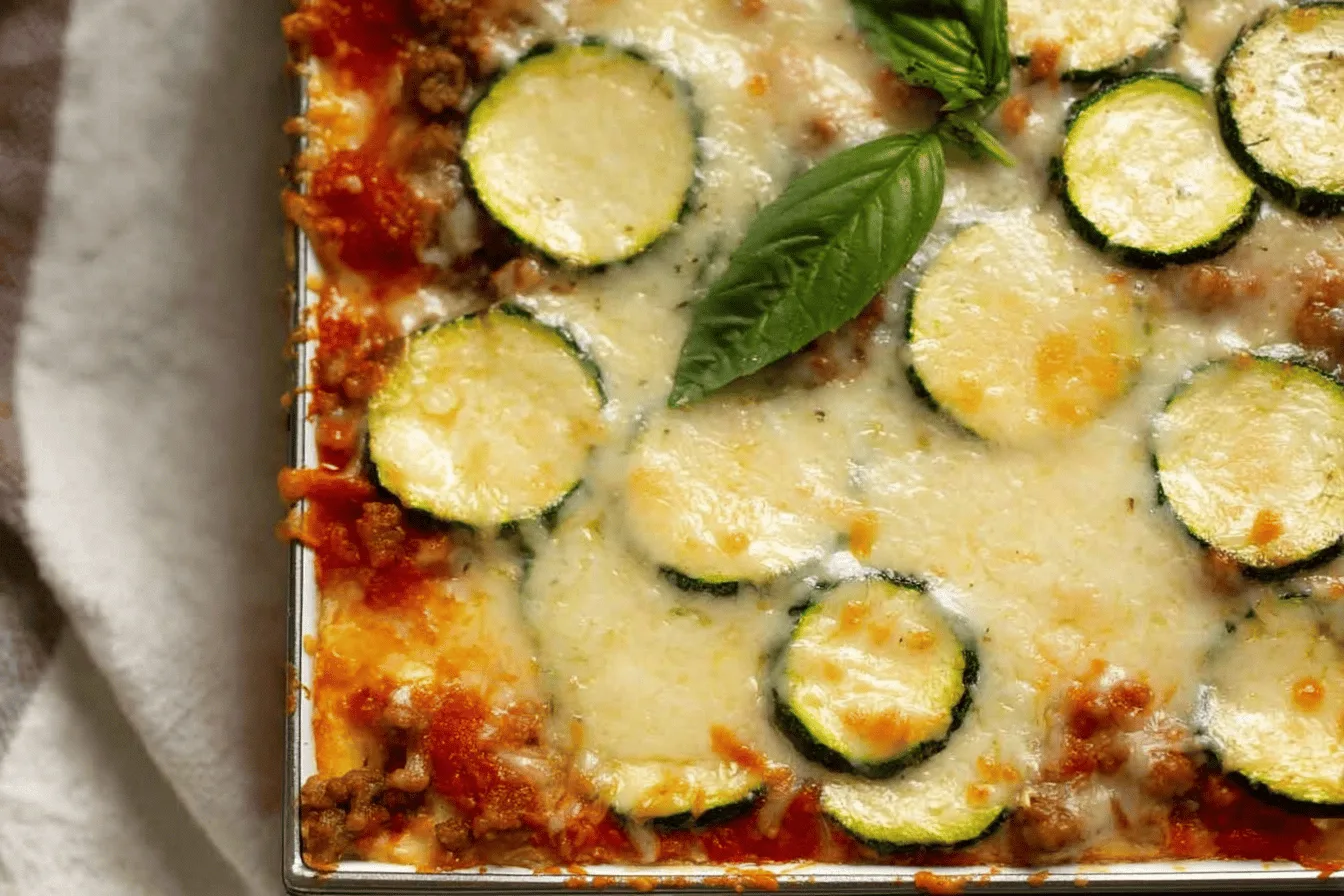Lightly grease a 9×13-inch baking dish with cooking spray or olive oil. Begin layering the casserole starting with a layer of zucchini slices to cover the base of the dish completely. Spread half of the meat mixture over the zucchini. Add another layer of zucchini slices, and then spread the remaining half of the meat mixture on top. Finish with a final layer of zucchini slices.