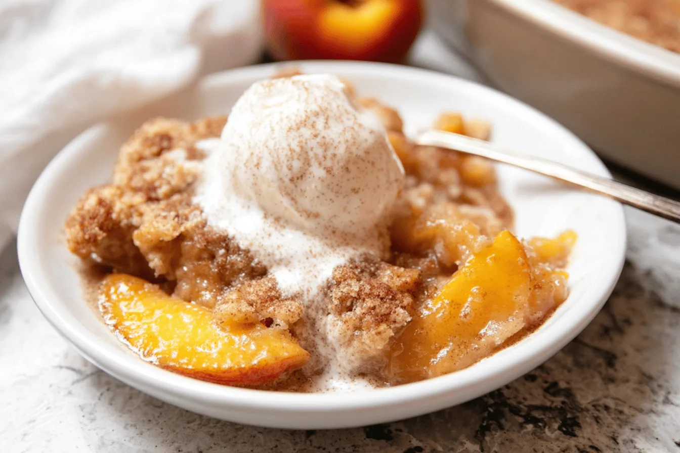 Peach cobbler is delicious on its own or paired with a scoop of vanilla ice cream or a dollop of whipped cream.