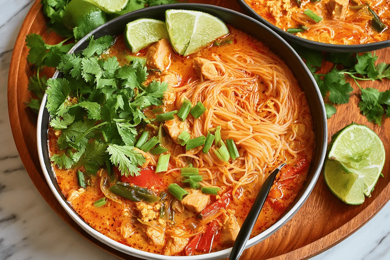 The Thai Red Curry Noodle Soup is a warm and comforting dish that combines the bold flavors of Thai cuisine into a delightful soup bowl. With its rich, creamy texture from coconut milk, a spicy kick from red curry paste, and the savory addition of noodles and proteins, this recipe offers a dynamic explosion of flavors and textures. Whether you’re cooking for your family, a group of friends, or just yourself, this recipe promises to brighten your mealtime with a touch of zest and aromatic flair.